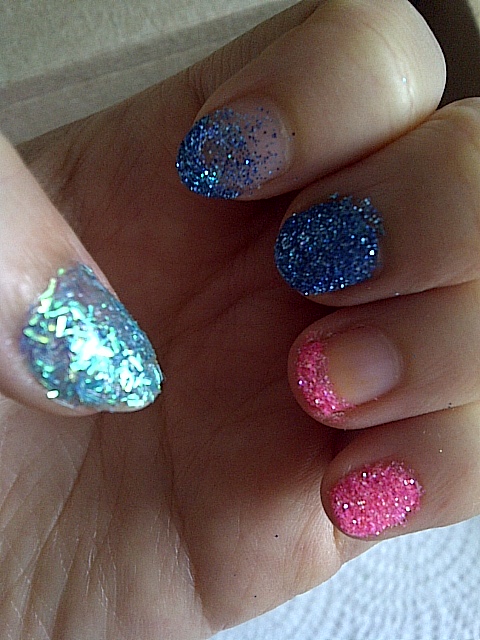 Probably my favourite out of the 3 because I love bling. It contains the glitter on the one end and a matching base colour on the other end. Which is great because you get the shade of nail colour that exactly matches the glitters. Many styles can be created I have demonstrated in the swatches below a plain full nail, a French tip or an ombre nail. If you just do one colour it looks great if you just do the glitter on your ring finger for an accent nail. Because the glitter is so fine the nails are smooth and you barely even notice they are there.