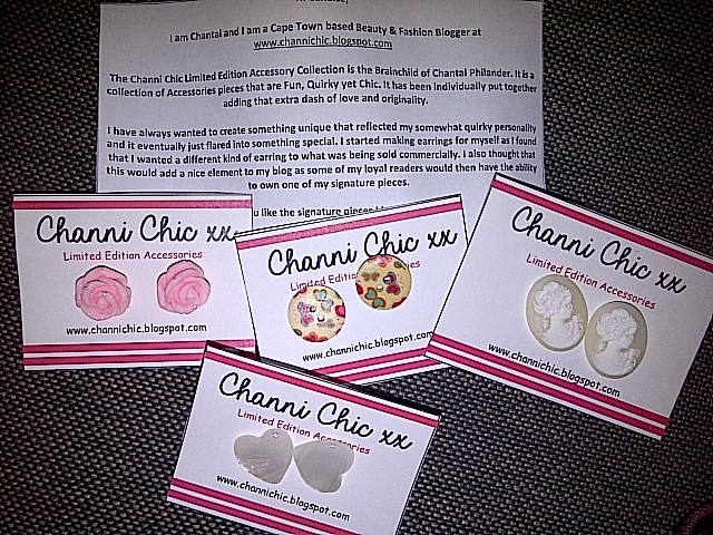 The earrings are rather inexpensive. It ranges from R20 to R30. No reason not to spoil yourself with more than one pair. All earrings are individually put together adding that extra dash of love and originality. Can be purchased from her blog and can be shipped all across South Africa http://channichic.blogspot.com/p/shop.html