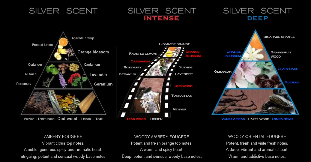 SILVER SCENT ORIGINAL: The first Jacques Bogart SILVER SCENT, launched in 2005.The inspiration is focussed on the 40th black and white movies with Mr Humphrey Bogart as the main attraction. A fragrance with top notes of Orange Blossom, Frosted Lemon and Bigarde Orange. Heart Notes of Coriander, Nutmeg, Cardamom, Lavender, Geranium and Rosemary. And base notes of Vetiver, Tonka bean, Oud Wood, Lichen and Teak. Smells like a typical vintage male fragrance.If your tastes lean toward ambery fragrances, like that of Diesel Only the Brave or Chanel Allure Homme, Jacques Bogart Silver Scent ORIGINAL will be more up your alley.