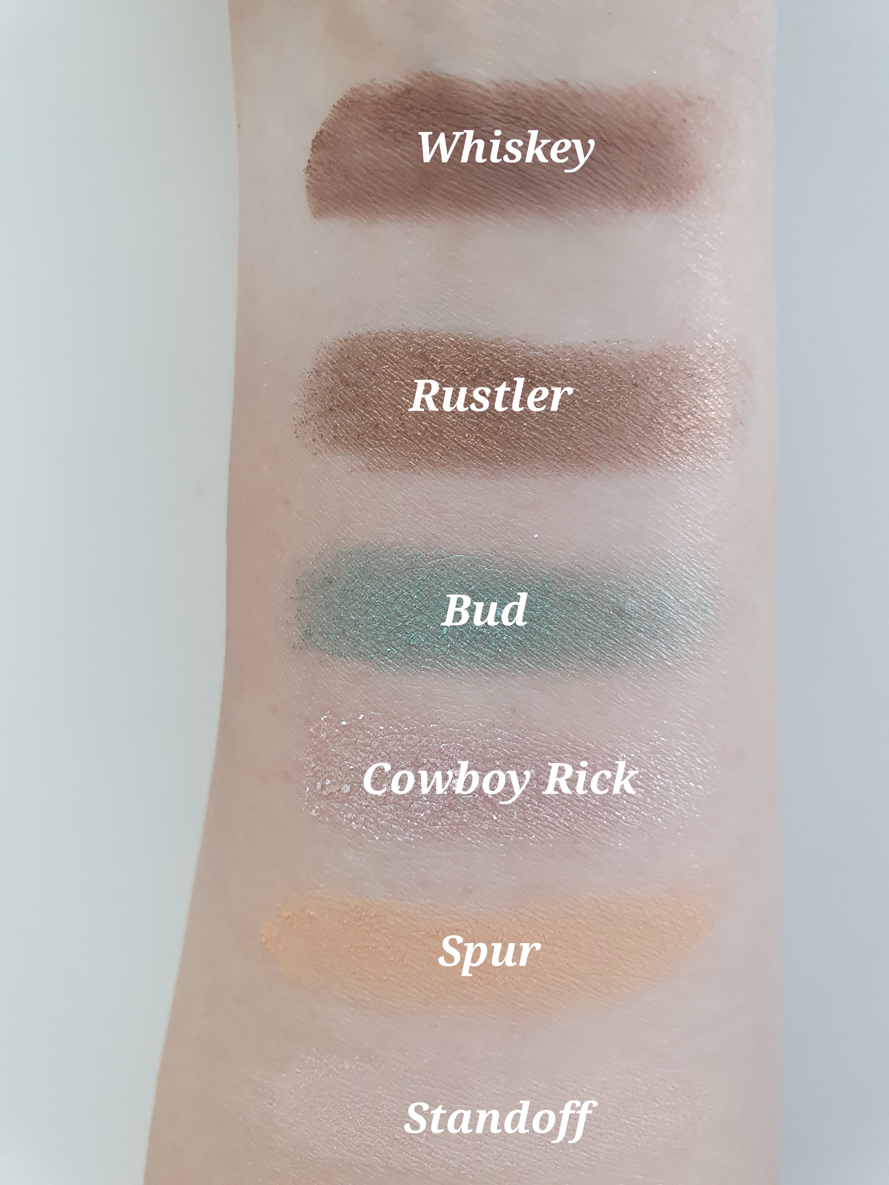 Cowboy Rick: A warm silver creamy metallic. This is probably my favourite shade from the palette. I like to use this as a highlighter shade to finish off the look on the inner corners of my eye and dab with my finger some of this on the middle of my eyelid. It is just so sparkly and whilst you can see the glitter partials it is not in any way chucky. It can also offer a nice little sheen to the lid if you use it on it’s own.
