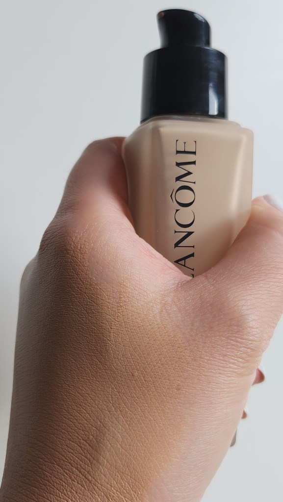 The frosted, heavy recyclable glass bottle made with 25% recycled glass. With a luxurious black lid donned with Lancome’s signature rose emblem gives this foundation it’s luxe style. I would say though since the bottle is frosted the actual shade looks different from what you see on the bottle so definitely swatch them if you are looking for a shade.